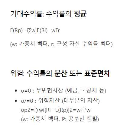 이런 방식으로 각 포트폴리오의 리스크와 기대 수익률을 구할 수 있습니다.