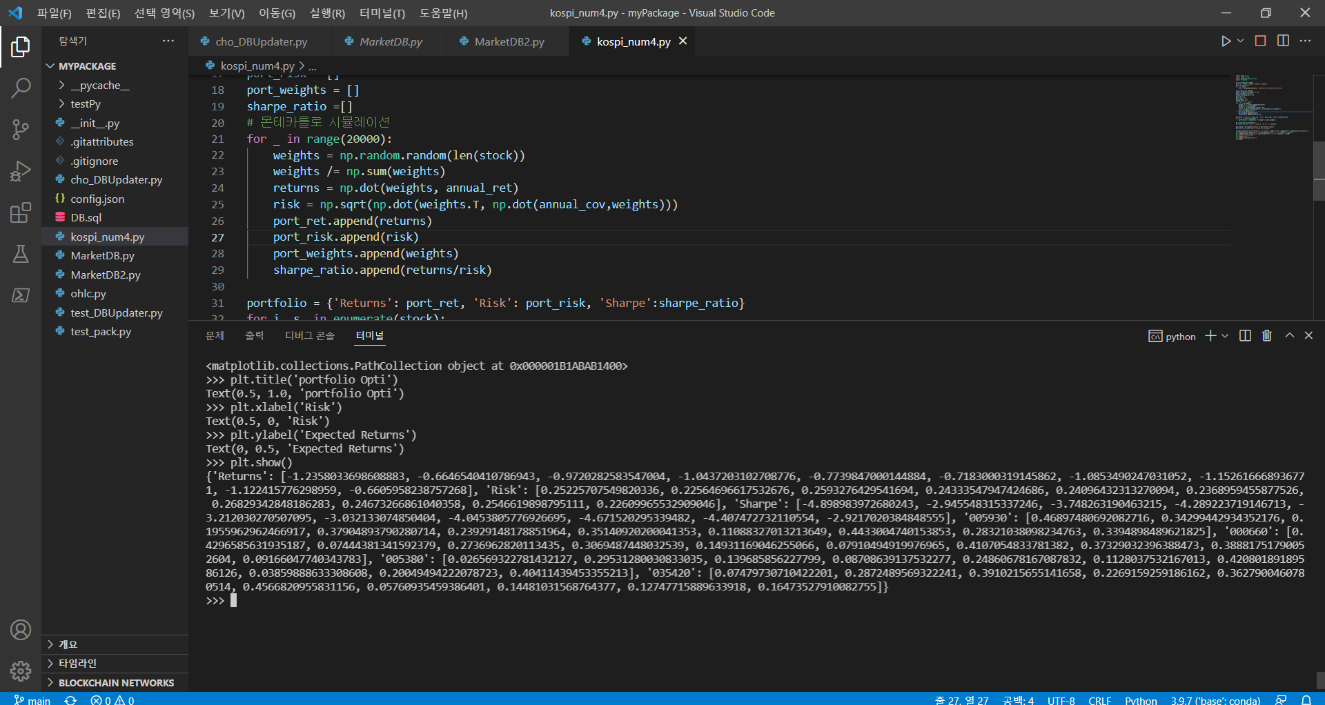다음번에는 구한 포트폴리오를 모두 그래프 상에 옮겨보겠습니다.
