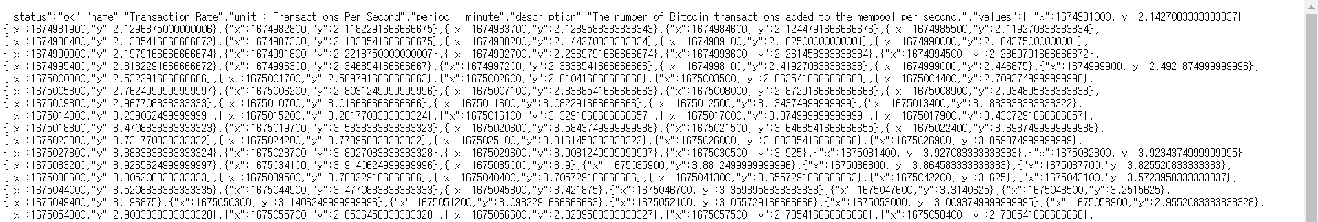 url = "https://api.blockchain.info/charts/transactions-per-second?timespan=5days&rollingAverage=8hours&format=json"
