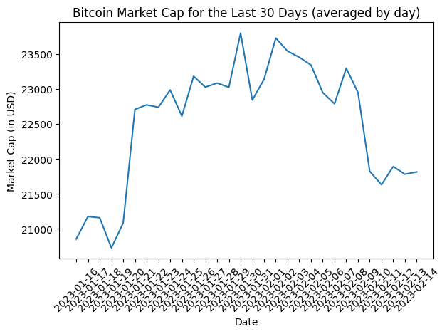 plt.title('Bitcoin Market Cap for the Last 30 Days (averaged by day)')