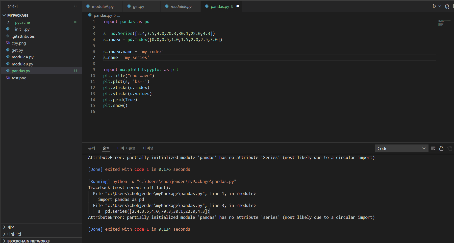 판다스를 이용해 제가 입력한 값을 x, y축으로 구성된 그래프로 재구성하려는 와중에 이런 오류가 발생했습니다.
