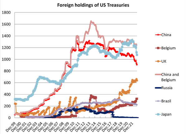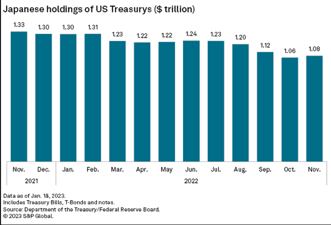일본은 2020년도부터 미국채 최대 보유국이다. 중국이 미국채 매수량을 줄이며 일본의 미국채 보유량이 중국을 넘어섰다. 중국은 달러의 영향권에서 벗어나고, 외화자산 매도를 통한 자국 통화 절상을 목표로 하여 미 국채 보유고를 줄이고 있다.