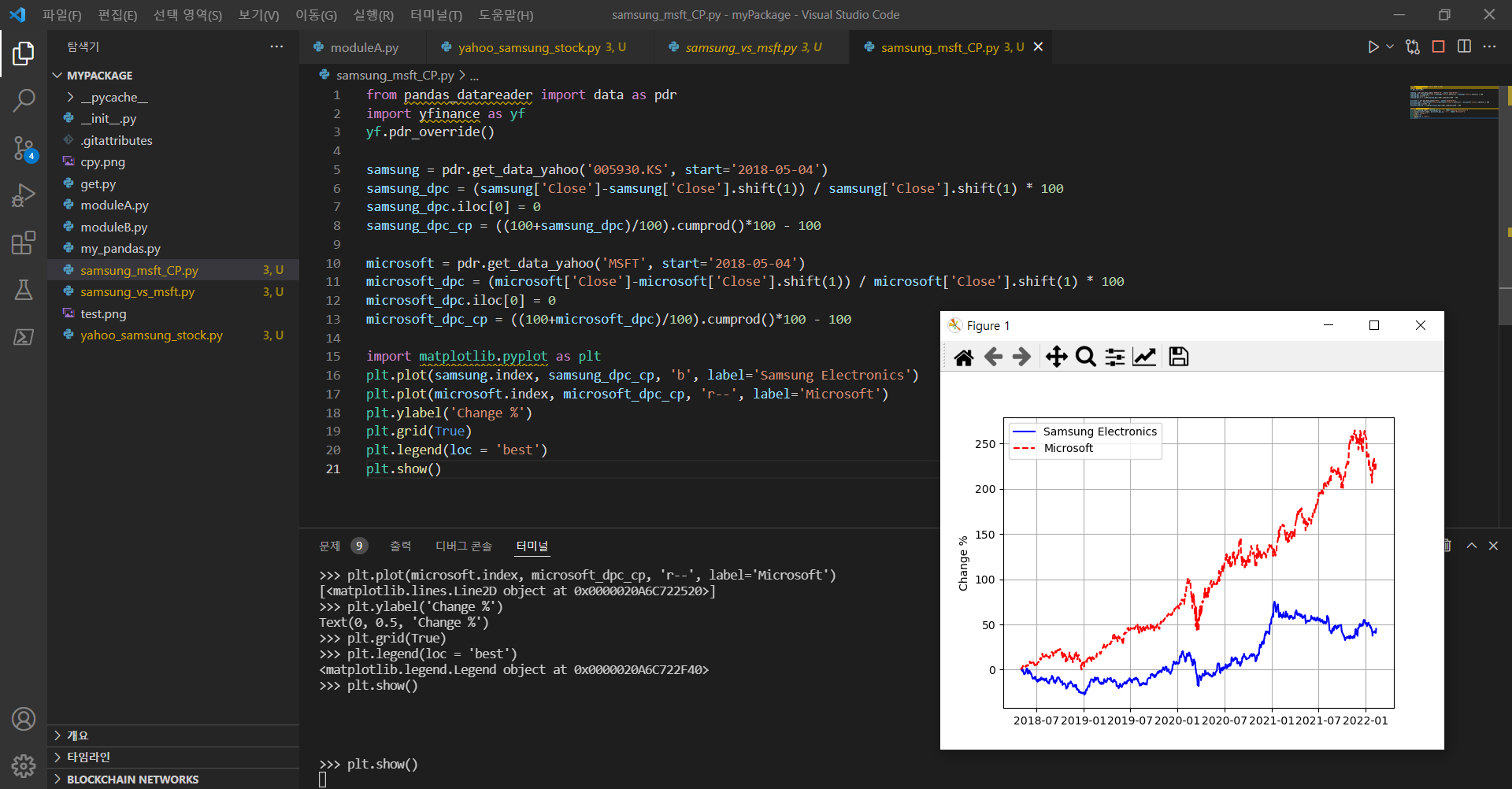 plt.show()제가 까먹었는데 matplotlib도 설치해야하네요. 죄송합니다.